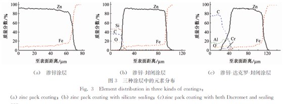 圖3為不同涂層截面 EDS線掃描結(jié)果。結(jié)果 表明:滲鋅涂層中鋅含量由表面(鋅質(zhì)量分?jǐn)?shù)約 92%)向內(nèi)緩慢下降,至涂層與界面處(鋅質(zhì)量分?jǐn)?shù) 約81%)后,開(kāi)始急劇減少。根據(jù)計(jì)算及理論分析, 滲鋅層表層為Γ相層(FeZn10),靠近基體處為δ相 層(Fe11Zn40)[1819]。滲鋅-封閉涂層使用硅酸鹽封閉 劑,故在封閉層區(qū)域Si、C、O元素含量較高。滲鋅- 達(dá) 克羅-封閉涂層使用含鋁封閉劑,故在封閉層處有明顯C、O、Al元素分布;達(dá)克羅層則有Zn、Al、Cr、 O元素的分布。