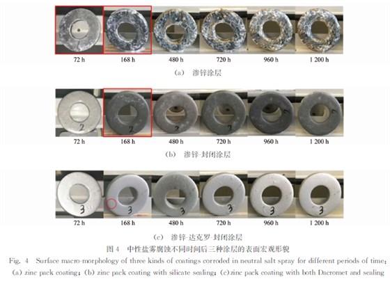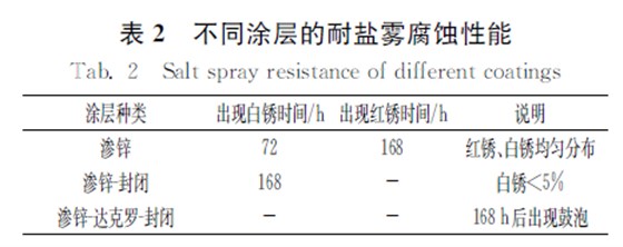 (3)綜合中性鹽霧試驗(yàn)和電化學(xué)特征,滲鋅-封 閉涂層和滲鋅-達(dá)克羅-封閉涂層具有較滲鋅涂層更 為優(yōu)異的耐蝕性,其中使用含鋁封閉劑的滲鋅-達(dá)克羅-封閉涂層的耐蝕性最佳。