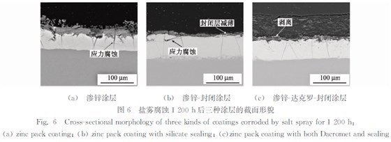 (2)滲鋅涂層的腐蝕形式主要為應(yīng)力腐蝕,即 腐蝕介質(zhì)通過(guò)應(yīng)力產(chǎn)生的裂紋直接進(jìn)入涂層中,腐 蝕產(chǎn)物又使裂紋進(jìn)一步擴(kuò)展,如此往復(fù),造成涂層的 嚴(yán)重腐蝕;滲鋅-封閉涂層中,封閉層的腐蝕主要表 現(xiàn)為點(diǎn)蝕和全面腐蝕并存的形式,點(diǎn)蝕坑可直達(dá)滲 鋅層,使?jié)B鋅層發(fā)生應(yīng)力腐蝕,全面腐蝕使封閉層厚 度明顯減??;滲鋅-達(dá)克羅-封閉涂層的耐蝕性優(yōu)異, 但封閉層存在剝離現(xiàn)象,可能對(duì)耐蝕性產(chǎn)生影響。