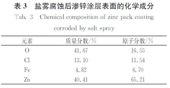 鹽霧腐蝕1200h后涂層表面的微觀形貌如 圖5所示。并對(duì)鹽霧腐蝕后滲鋅涂層表面進(jìn)行 EDS分析,結(jié)果如表3所示。