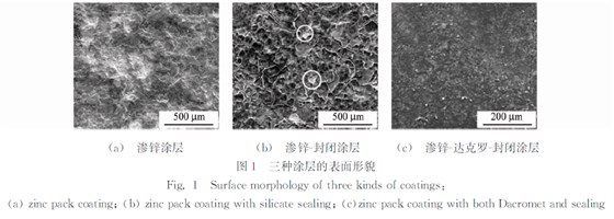 (1)滲鋅涂層表面不平整且存在坑洞,對(duì)耐蝕 性不利;滲鋅-硅酸鹽封閉涂層表面有裂紋,對(duì)耐蝕 性有一定影響;滲鋅-達(dá)克羅-含鋁封閉涂層表面平 整無(wú)坑洞,對(duì)基體的保護(hù)性能優(yōu)異。