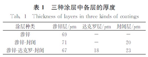 在滲鋅后處理領(lǐng)域,已開(kāi)發(fā)出各種復(fù)合涂層,以 提高耐蝕性。在滲鋅涂層外浸涂封閉劑,經(jīng)固化后 形成封閉層,可有效封閉涂層表面微孔,延長(zhǎng)涂層的 使用壽命[11-12]。達(dá)克羅涂層是一種由數(shù)十層被鉻酐 鈍化后的鋅、鋁片層疊加形成的膜層,具有極佳的耐 蝕性[13]。但達(dá)克羅涂層的耐磨性不佳,施工中的磕 碰易導(dǎo)致涂層破損,使其實(shí)際耐蝕性差于滲鋅涂 層[14],因此通常通過(guò)在達(dá)克羅涂層外部浸涂封閉劑 加以保護(hù)[15]。
