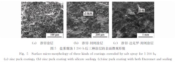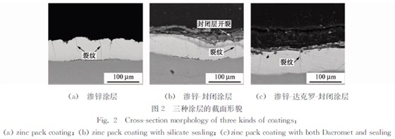 (2)滲鋅涂層的腐蝕形式主要為應(yīng)力腐蝕,即 腐蝕介質(zhì)通過(guò)應(yīng)力產(chǎn)生的裂紋直接進(jìn)入涂層中,腐 蝕產(chǎn)物又使裂紋進(jìn)一步擴(kuò)展,如此往復(fù),造成涂層的 嚴(yán)重腐蝕;滲鋅-封閉涂層中,封閉層的腐蝕主要表 現(xiàn)為點(diǎn)蝕和全面腐蝕并存的形式,點(diǎn)蝕坑可直達(dá)滲 鋅層,使?jié)B鋅層發(fā)生應(yīng)力腐蝕,全面腐蝕使封閉層厚 度明顯減??;滲鋅-達(dá)克羅-封閉涂層的耐蝕性優(yōu)異, 但封閉層存在剝離現(xiàn)象,可能對(duì)耐蝕性產(chǎn)生影響。