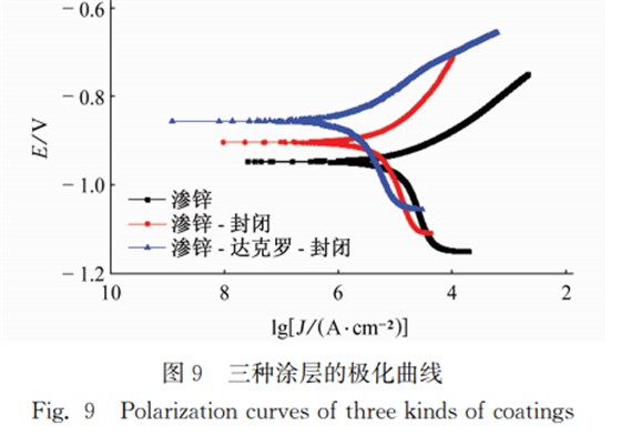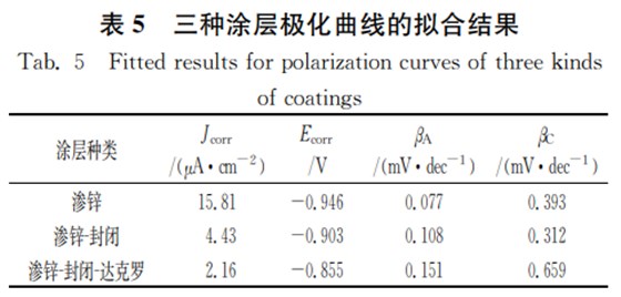 不同涂層的極化曲線如圖9所示,其擬合結(jié)果 如表5所示??梢钥闯?,與滲鋅涂層相比,滲鋅-封 閉涂層和滲鋅-達(dá)克羅-封閉涂層的自腐蝕電位都有 所提高,且腐蝕電流密度顯著減小。腐蝕電流密度越大表明涂層的腐蝕速率越大,耐蝕性越差,因此滲 鋅-封閉涂層與滲鋅-達(dá)克羅-封閉涂層的耐蝕性都較滲鋅涂層的耐蝕性明顯增強(qiáng)。