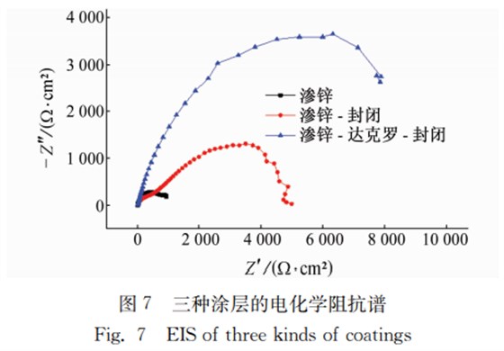 由圖7可見(jiàn):滲鋅-達(dá)克羅-封閉涂層的容抗弧 半徑最大,說(shuō)明其電化學(xué)反應(yīng)阻力最大,故耐蝕性最 好;滲鋅-封閉涂層的容抗弧半徑盡管小于滲鋅-達(dá) 克羅-封閉涂層的,但仍遠(yuǎn)大于單獨(dú)滲鋅涂層的,說(shuō)明其耐蝕性良好。